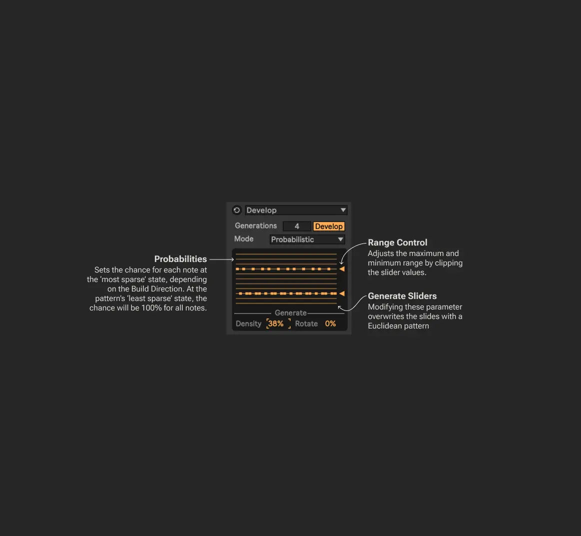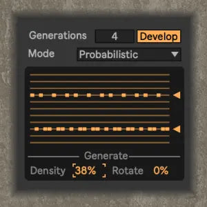 Develop reduces or increases the complexity of your MIDI clip over time. Say you have a pattern that you want to "build up" to by just playing fragments of the pattern, then, finally, at the end, the whole thing. Or the opposite - you want to remove an element from the mix, but not by bringing the fader down. Instead, just selectively remove notes each time the pattern loops. That's what Develop does. It can do so in a perfectly repeatable way using note muting, or in a probabilistic way, using chance.