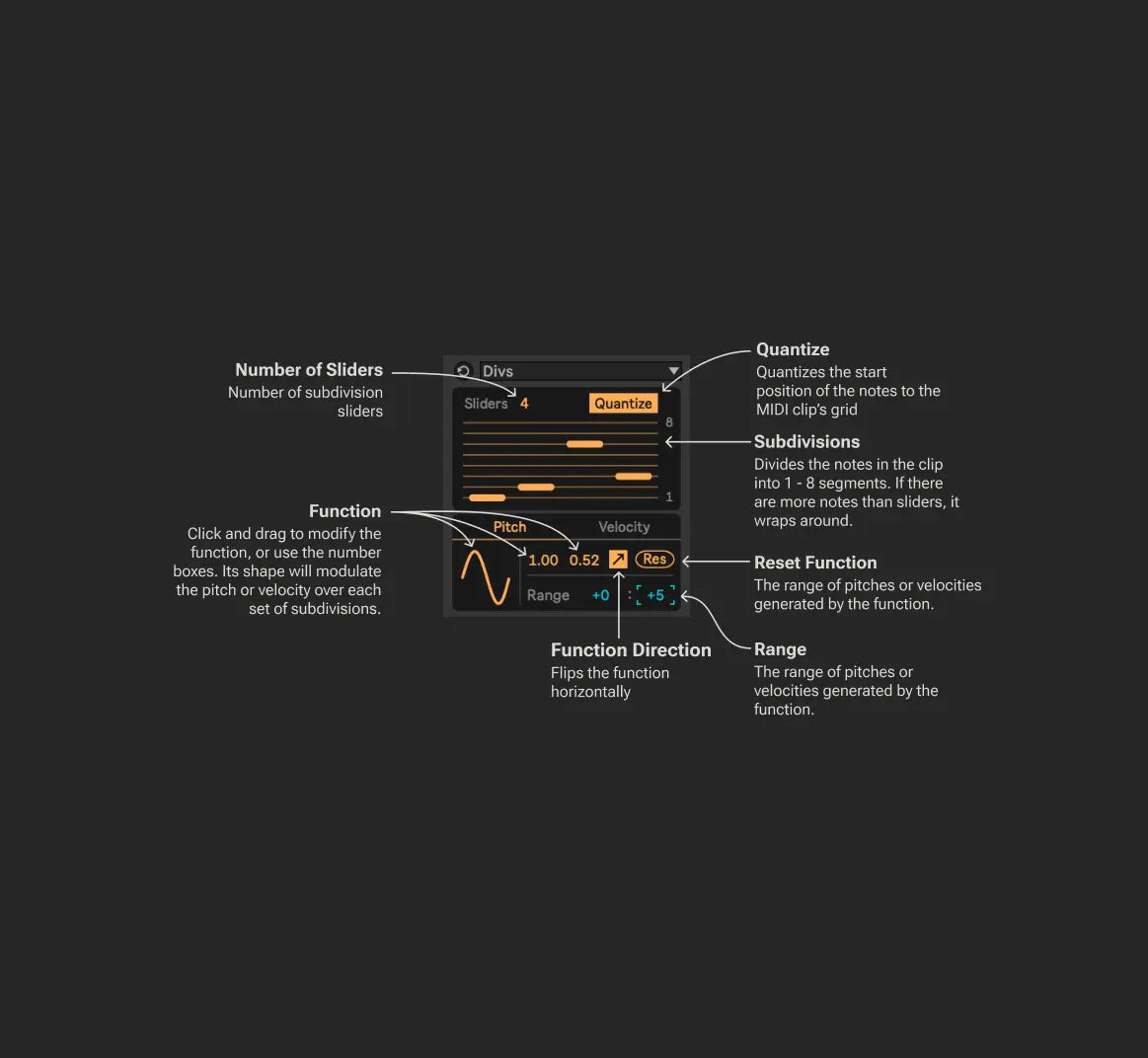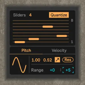 Quantized or Unquantized Rhythms: The tuplets this device produces don't always conform to the MIDI clip's grid ,which is one reason it produces such exciting and novel rhythms. Sometimes it's a bit too wild, though. For that reason, this device has a Quantize button that will lock the notes it creates to the MIDI clip's grid.