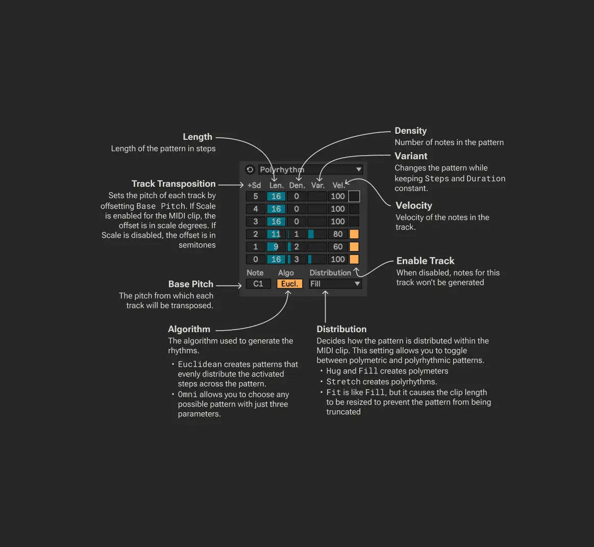 Polyrhythm is a multitrack algorithmic sequencer for generating a quick beat or melody. I really like using it with a drum rack to get a beat started. The length of each pattern can be set independently, which makes the rhythms it generates feel a lot less boring and loop-y.